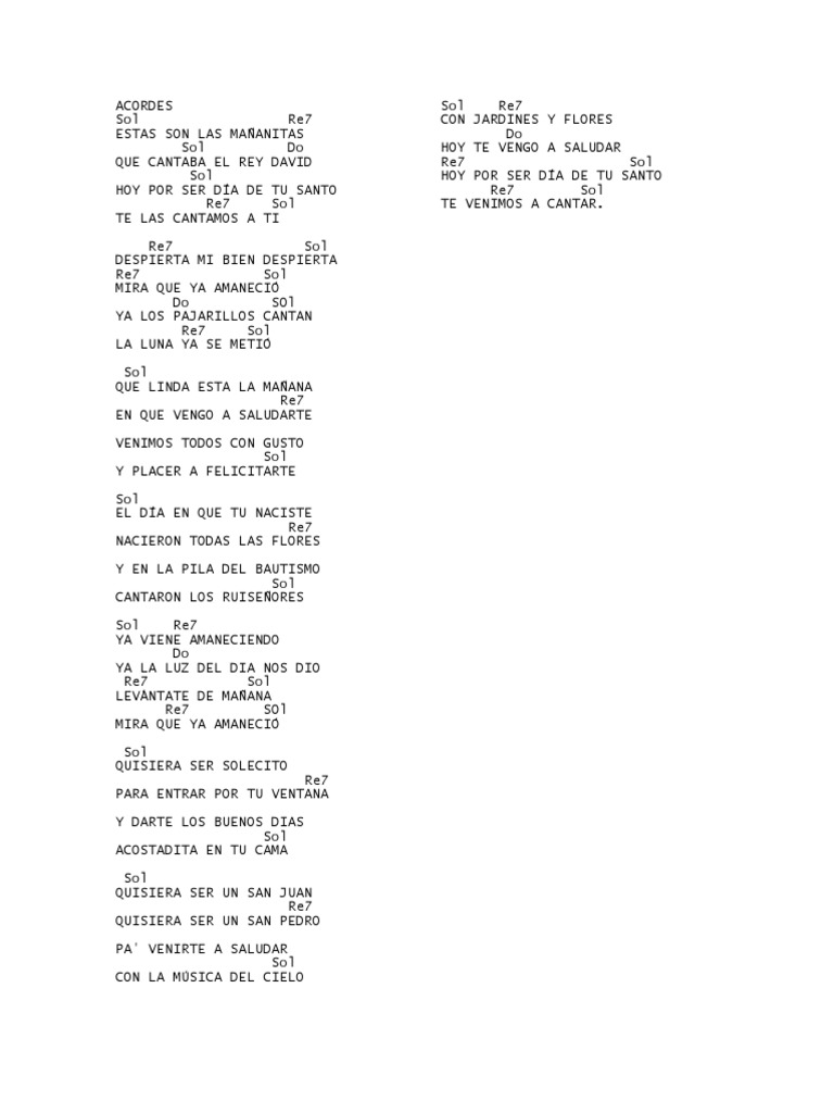 Mananitas - Aprende esta cancion y muchas g _ d7 estas son las mananitas g7 c que cantaba el rey david g hoy por ser dia de tu santo d7 g te las cantamos a ti.
